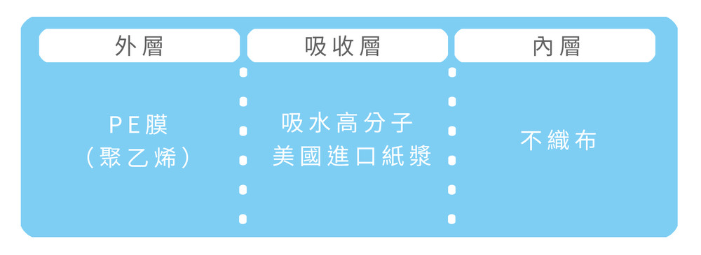 - 吸收層:吸水高分子 / 美國進口紙漿