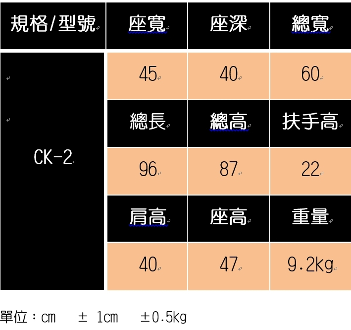 規格說明:1. 座寬18",座深16"。2. 前輪6"實心胎,後輪14"PU免充胎。3. 最大負載重量100公斤。符合「身心障礙者輔具補助基準表」輪椅-B款(輕量化量產型)功能特色:1. 固定扶手,固定靠腳,背可折鋁合金輪椅。2. 骨架材質為鋁合金 7003 管材,主體骨架保固六年。3. 坐墊為前高後低,分壓設計。4. 輕量級輪椅,輪椅重量僅 9.2kg。5. 可拆卸式座、背上墊,附加腿靠帶。注意事項:1. 展開輪椅,注意手指應向前平壓於坐墊不可向外,預防夾傷。2. 上、下輪椅務必將煞車固定,再乘坐輪椅,避免造成危險。3. 上、下輪椅,注意不可雙腳直接站立於腳踏板上,以免翻覆。衛部醫器陸輸壹字第003138號中市衛器廣字第10808231號
