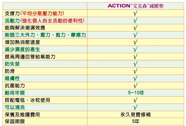 Action’’艾克森’’減壓床墊各式各樣的款式預防壓瘡的形成將活動能力及發生褥瘡的危險性加入選購的考量,慢慢選擇減壓墊是非常重要。Action’’艾克森’’減壓床墊系列商品都享有免費試用3天,購買前才有充分評估,我們對Action’’艾克森’’減壓床墊品質有自信,所以才能提供這項服務,請多利用。因材質能分散壓力、消除剪力,並且不需要麻煩的設定及任何組裝程序,只要將減壓墊放在床上即能舒適使用。建議一開始就使用全身用的尺寸睡得舒適。