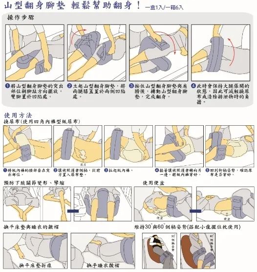 TV-109 | 山型防水翻身腳墊 (防水外套,外套可以清洗)山形翻身腳墊,輕鬆幫助翻身!衛署許可證:未列管影片示範:幫助翻身,活動關節,協助清理排泄物山型透氣翻身腳墊是一款應用鐘擺運動及槓桿原哩,輕鬆協助翻身的劃時代體位變換器。可預防下知關節變形、攣縮及褥瘡,並改善骨盆歪斜等問題,有效幫助老人或病人的照護需求。為什麼設計成這個形狀山型透氣翻身腳墊的底部為圓弧的船底形狀,因此可輕鬆地幫助翻身。此外,中央前端的圓形突出部分,可固定側躺時位於上方的腿部姿勢