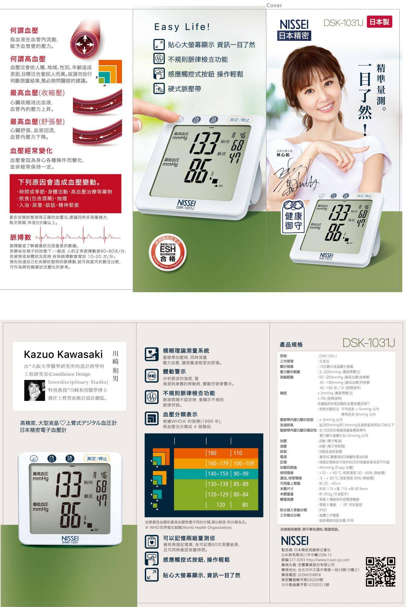 型號: DSK-1031J可測量上臂圍: 約 22 ~ 42cm(硬式壓脈帶)本體尺寸: 約長 115 ×寬 115 ×高 65.9mm本體重量: 約 250g (不含配件)顯示螢幕: 15 位數位液晶顯示螢幕記憶: 兩個記憶庫各可保存60次的測量結果與其平均值電源: 專用AC變壓器或3號鹼性電池4個建議售價:3000元實際金額請洽各通路使用前請詳閱說明書警語及注意事項衛部醫器輸字第030269號知名設計師Kazuo Kawasaki 川崎和男監督設計貼心的大螢幕顯示,資訊一目了然感應觸控式按鈕,操作輕鬆模糊理論測量系統不規則脈律顯示功能血壓分類顯示可以記憶兩組量測值體動符號